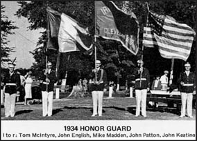In addition to the assistance provided by the MacSwiney Club, Cannon Tailors was a “Godsend” to the early WSIA. William Cannon, from Cannon Tailors, was able to provide Club members with uniforms at a greatly reduced cost. Further, Cannon often stepped in to provide repairs, cleaning and storage of uniforms, often not even covering his own costs. The uniforms provided by Cannon were some of the most distinctive of the era, resulting in the WSIA units being able to stand out at parades and events. The WSIA marching units would not have existed in the form they did in the early years but for William Cannon and the Cannon family. The Club thought so much of the relationship with Cannon that they had photos of the units taken outside of Cannon Tailors in the 1930’s. So much attention to detail involving marching uniforms was given, that by 1938 the Club acquired a logo from New York for the men’s hats that featured a shamrock and a harp over the American and Irish flags.